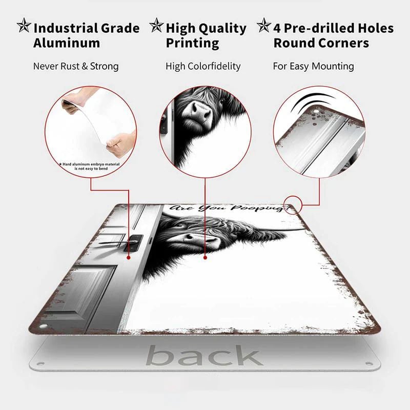 "Knock, knock! Who's there?" It’s your new favorite bathroom companion! Add a heavy dose of laughter to your daily routine with this witty piece of wall art. Featuring a curious Highland cow peeking around a door frame, this sign asks the bold question everyone else is too polite to ask. It is the perfect mix of rustic charm and comedy that guarantees a smile from every guest.